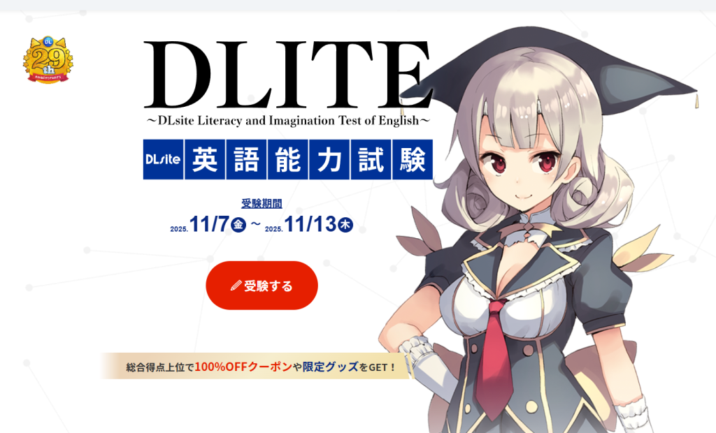 現在、DLSiteでは創業29周年記念「DLITE~DLsite英語能力試験~」を実施中です。これまで、DLSiteの検定試験は複数回行われてきましたが、問題が全て英語というのは初であり、かなり難易度の高い試験となっております。 試験概要 公式サイトより以下抜粋に...